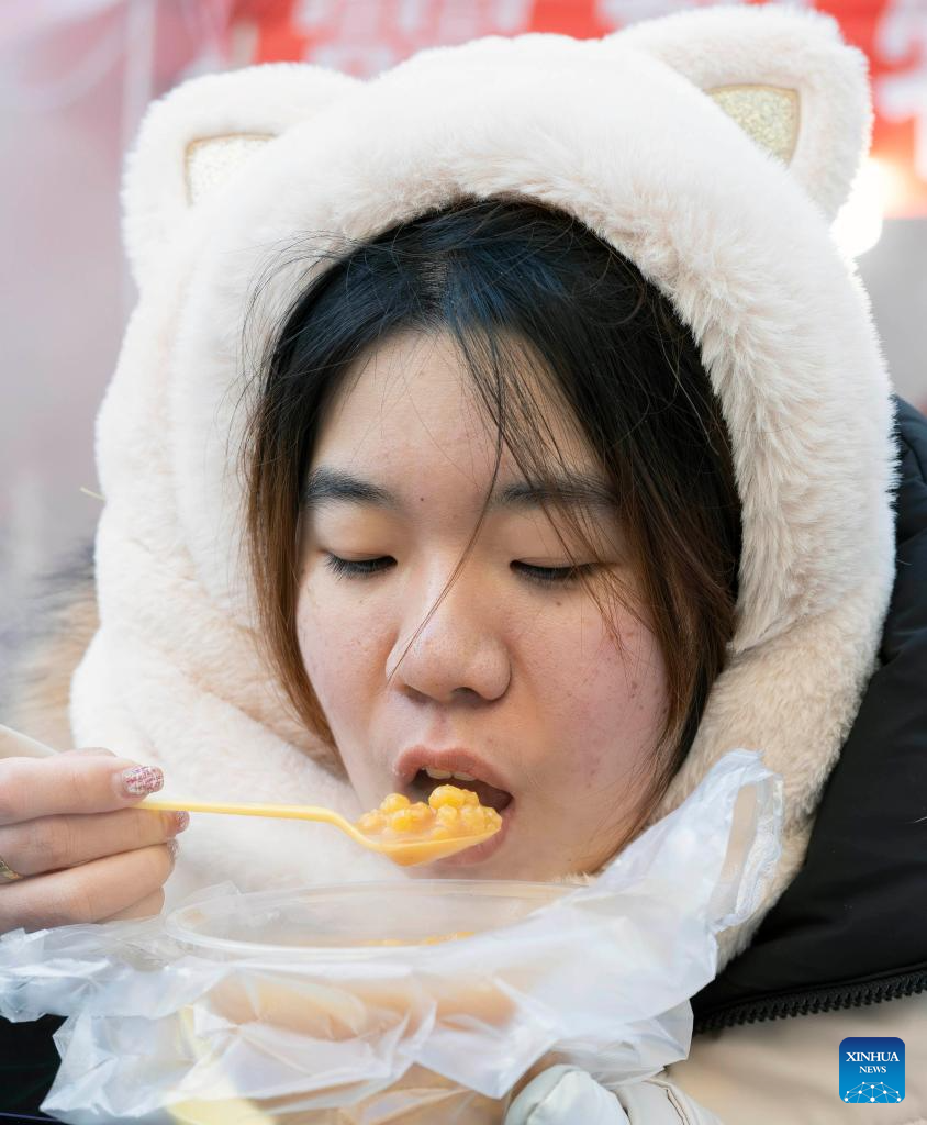 A tourist tastes corn porridge at the Hongzhuan Morning Market in Harbin, northeast China's Heilongjiang Province, Jan. 22, 2024.