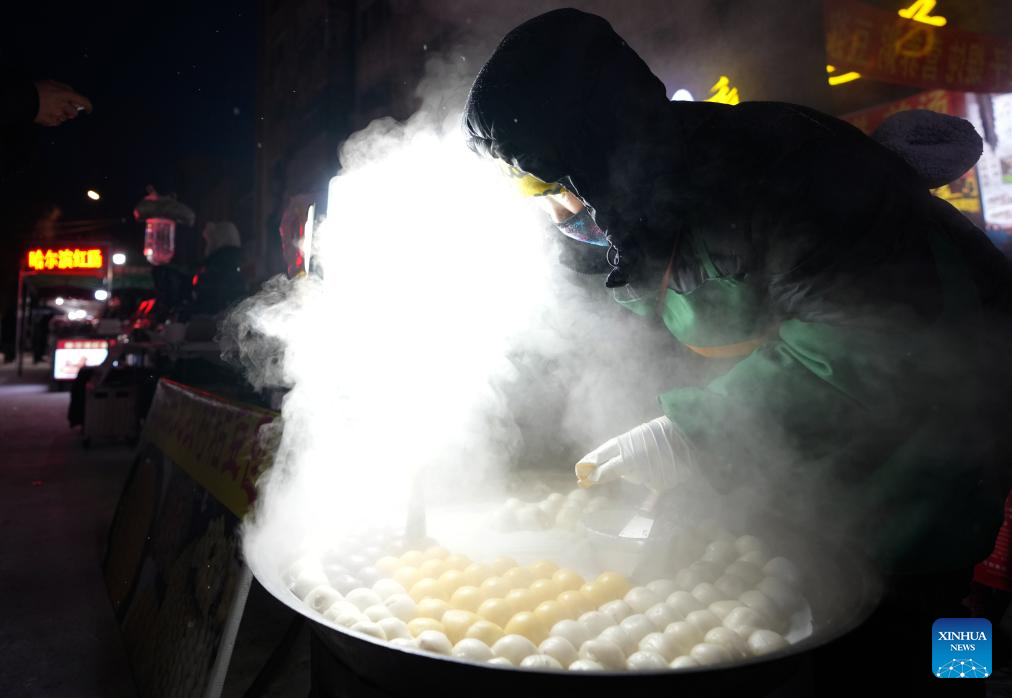 Tourists taste sticky steamed buns stuffed with bean paste at the Hongzhuan Morning Market in Harbin, northeast China's Heilongjiang Province, Jan. 22, 2024.